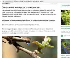 Выращивая на своем участке виноград, вы могли заметить, что с наступлением весны после обрезки, лоза начинает «плакать». Этот процесс для растения является естественным, так как запускается активное движение соков. Но чрезмерное их выделение должно быть вовремя замечено. Это сигнализирует о том, что нормальное развитие нарушено и это необходимо исправить.