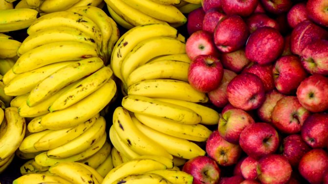 - Также в этих продуктах содержится огромное количество полезных макро- и микроэлементов, в частности, кальция и фосфора (необходимых для укрепления костей и зубов), магния, натрия и меди. Яблоко, банан содержат в себе большие количества железа и калия, которые обеспечивают процессы кроветворения и регулируют работу миокарда.