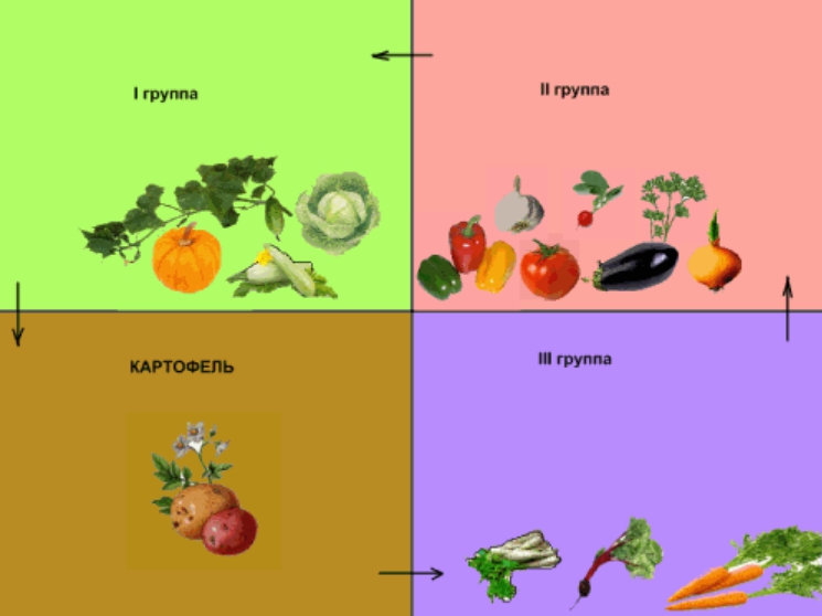 Картошка | Бобовые, тыквенные культуры, капусту | Любые корнеплоды, лук, чеснок | Овощи из семейства пасленовых |