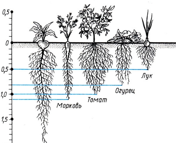 От глубины корневой системы зависит горизонт грунта, откуда растение берет основную часть питательных веществ