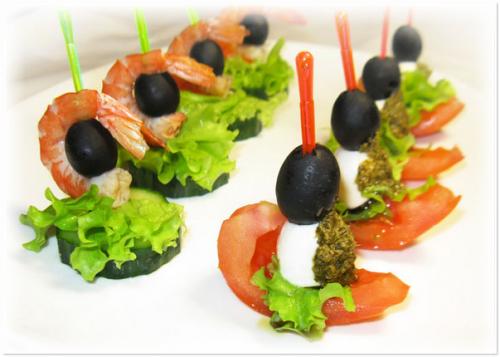 Зеленые канапе с креветками и маслинами
