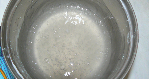 - Варка крахмала. В подходящую кастрюлю или котел засыпать крахмал влить воду, тщательно размешать. Поставить на огонь, довести до кипения и варить на среднем огне 2 часа. Массу необходимо периодически перемешивать, что бы избежать появления комочков.
