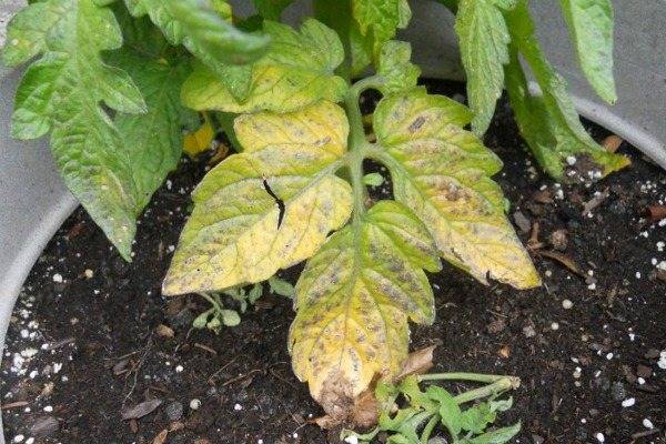Если томатам не хватает нескольких элементов сразу, листва покрывается желто-зеленой мозаикой, стебель куста вытягивается.