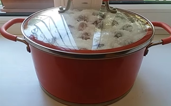 4. Чередуя слои сахара и ягод уложить весь урожай в кастрюлю и накрыть крышкой. Оставить смесь в прохладном месте, чтобы она не закисла, минимум на 1 сутки.