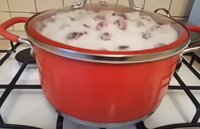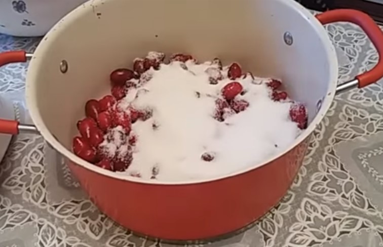 Когда косточка удаляется, выделяется много сока, поэтому его нужно потом добавить к плодам. Кизил засыпается сахаром и стоит в таком виде примерно 3 часа. Этого времени вполне хватает, чтобы плоды пустили сок, а сахар практически растворился в нем. В емкость с содержимым следует добавить количество воды, указанное в рецепте.