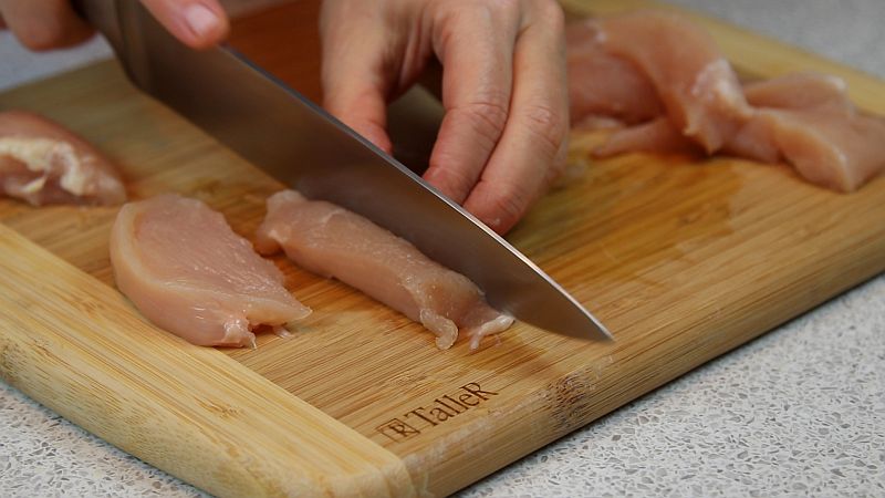 - Куриное филе разрезаем как обычно. Присаливаем и перчим. Даём настояться около 15 минут.