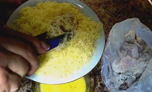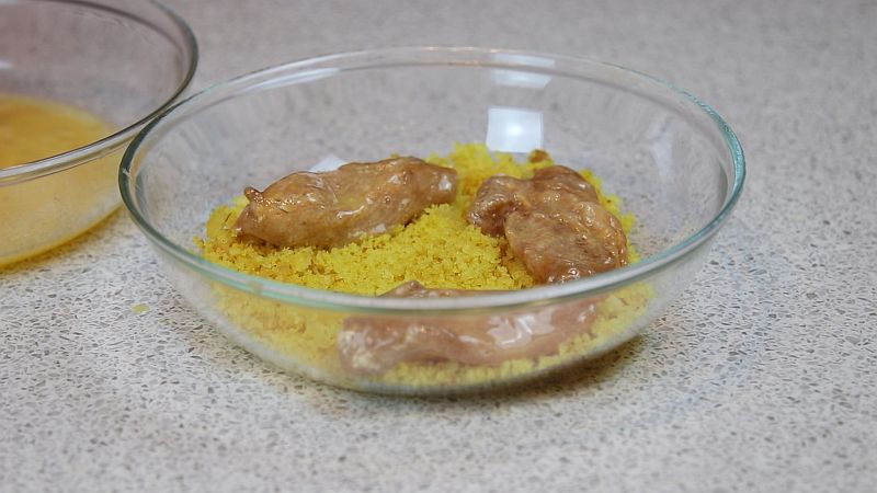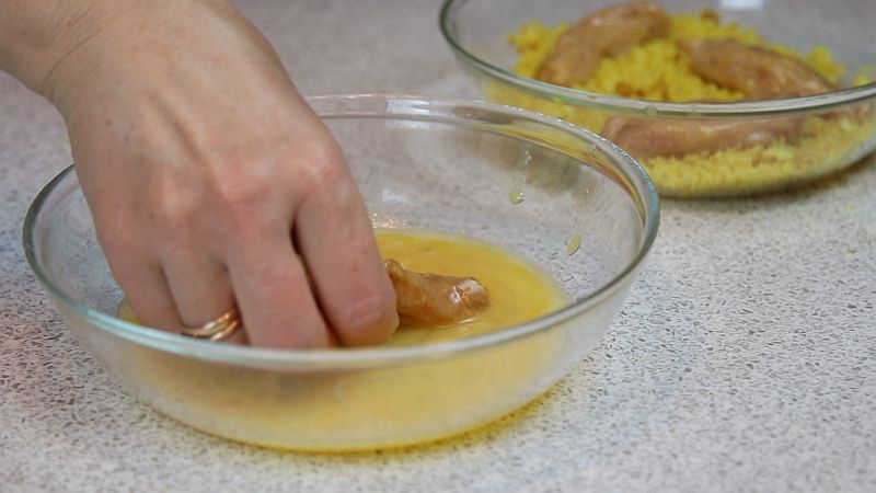 - Каждый кусочек обмакните в яичную смесь.