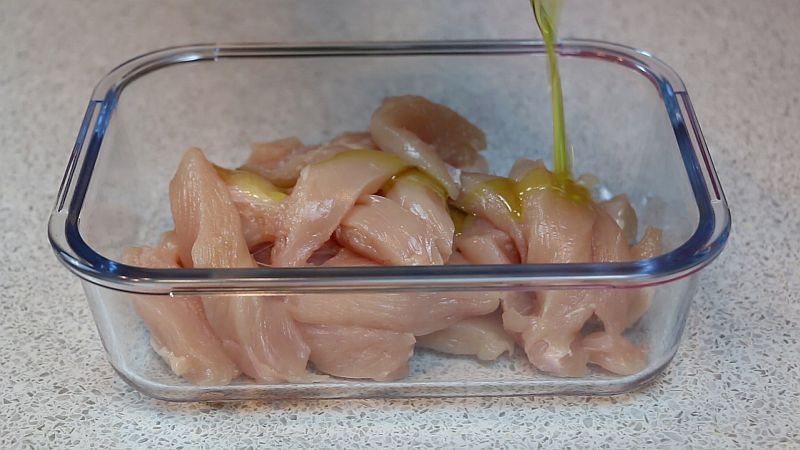- В другую миску помещаем кусочки куриного филе, добавляем туда оливковое масло и перемешиваем руками кусочки куриного филе с растительным маслом.