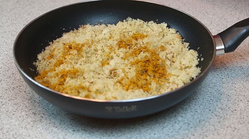 - В отдельной миске готовим панировку: смешиваем панировочные сухари, натертый сыр, можно добавить сюда же немного любимых специй.