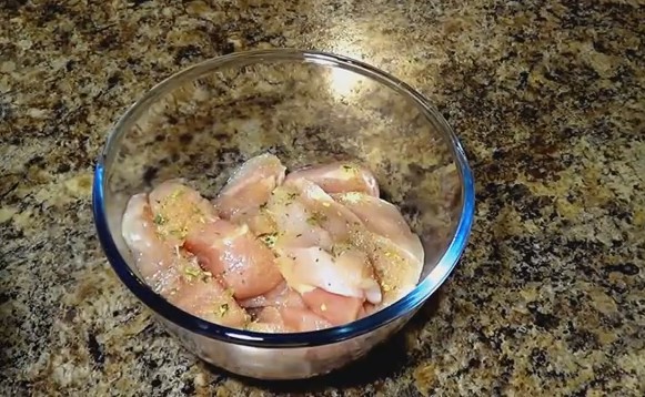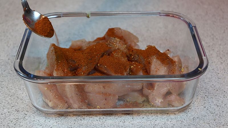 - Помещаем кусочки филе в миску. Высыпаем поверх специи: красный перец чили молотый, черный молотый перец, порошок сушеного имбиря и соль. Вливаем оливковое масло и воду в указанном количестве. Тщательно перемешиваем все вместе, чтобы каждый кусочке филе со всех сторон покрылся жидкостью и пряностями. Оставляем курицу на десять-пятнадцать минут для маринования.