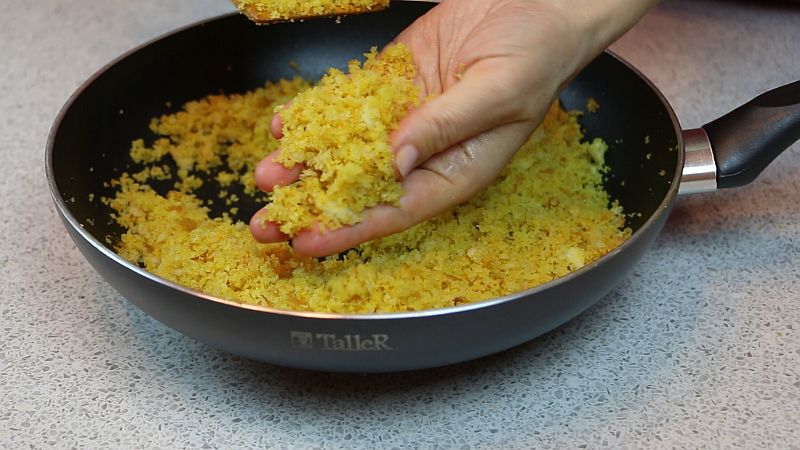 Твердый сыр натираем на мелкой терке. Очень хорошо по вкусу и текстуре подходит пармезан. Сливочное масло размягчаем до пластичного состояния. Смешиваем с сухарями сырную стружку, сливочное масло и соль. Руками перетираем крошку, чтобы все сухие компоненты хорошо распределились друг с другом.