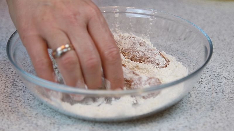 - В широкую емкость с бортами высыпаем муку. Частями выкладываем прямо в муку промаринованные кусочки филе и обваливаем их со всех сторон.