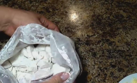 Пакет закройте резиночкой, а далее покидайте и побросайте из рук в руки, чтобы мука прилипла к кусочкам. Таким образом, все куски будут обвалены равномерно.