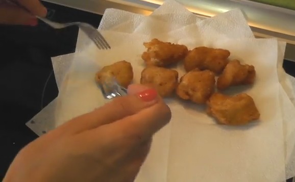 Готовые наггетсы извлекаем из фритюра и перекладываем на бумажное полотенце – лишний жир впитается в бумагу, и готовая закуска будет менее калорийной.