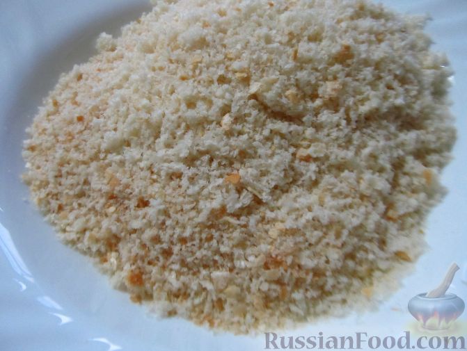 Панировочные сухари высыпаем в миску. К слову, можно использовать как уже готовые из магазина, так и сделанные из измельченного в блендере черствого белого хлеба