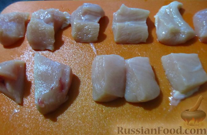- Куриное филе нарезаем кусочками около 1,5-2см.