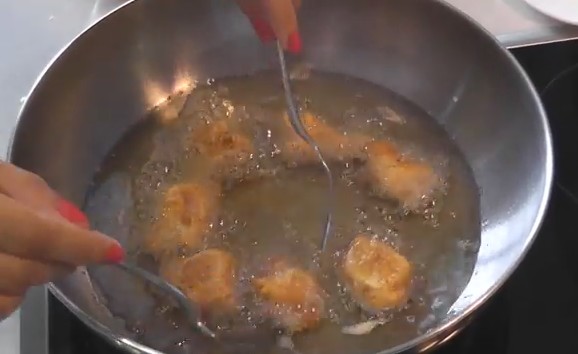 - Готовить их будем в глубокой жаровне, в которой разогрето достаточно много рафинированной Олейны. Когда они приобретут румяную — корочку выкладываем на решетку для того, чтобы стёк лишний жир.