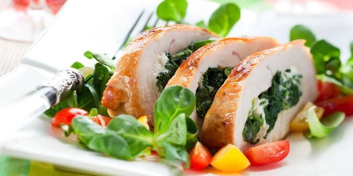 - Спустя примерно 15 минут, блюдо будет готово к подаче. Сочетать фаршированную шпинатом курятину можно с отварным картофелем или спагетти.