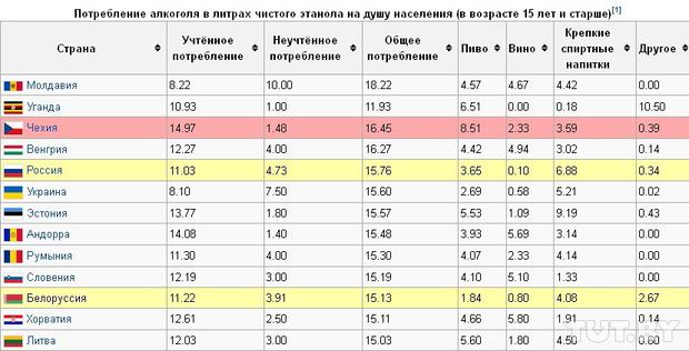 Статистика ВОЗ и данных Белоруссии значительно отличается. По данным Белоруссии государство даже не входит в топ 10 пьющих стран мира. Такое различие обусловлено тем, что Организация Здравоохранения высчитывает результат граждан от 15 лет, а Белоруссия делит общий объем потребления спиртного на полную численность населения. Включая новорожденных детей и людей пожилого возраста.