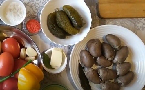 Отварите субпродукты в воде, добавив лаврушку, перец горошком, соль. Время варки – 50-60 минут. После откиньте, дождитесь, пока стечет отвар.