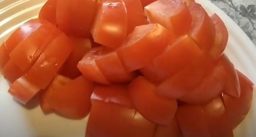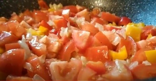 Добавьте помидоры, сладкий перец, готовьте 2-3 минутки, помешивая содержимое.