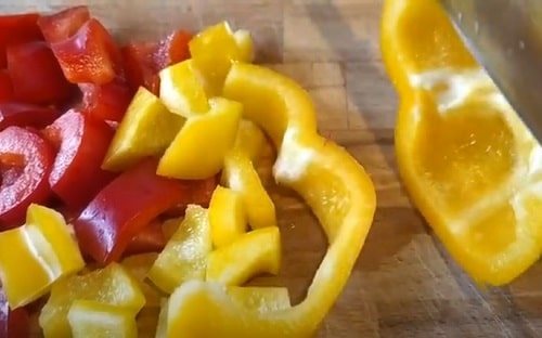 У болгарских перцев вырежьте семена, настрогайте мякоть кусочками, взяв по половинке овоща каждого цвета.