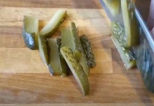 Огурчики настрогайте полосками, поделив овощ поперек на половинки.