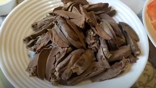 - Вымытые и разрезанные надвое индюшачьи сердечки очищают от сосудов, промывают ещё раз, сушат с помощью бумажного полотенца и нарезают мясо ломтиками около 3 мм толщиной.