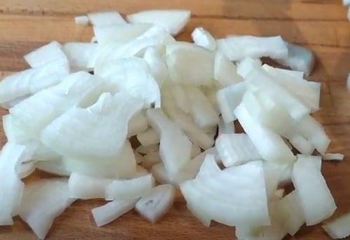 - Помойте субпродукты, нарежьте кусочками, выложит к луку. Обжаривайте, пока сердечки не станут почти готовыми. Переложите на тарелку.