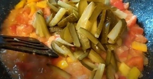 Тушеные сердечки с овощами и солеными огурцами на сковороде