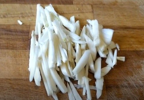 - Очищенное и вымытое мясо обсушивают на полотенце и режут четырьмя кусками вдоль, наподобие яблока.