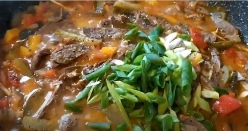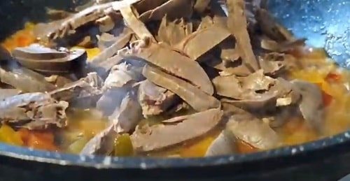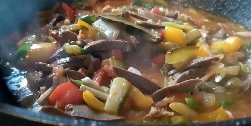 - К овощам с грибами засыпают кубики сердечек, приправляют их сахаром, солью, специями, затем перемешивают и готовят под крышкой в течение ещё 10 мин.