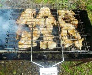 По готовности вынуть куски, по возможности убрать с них остатки приправы (во избежание пригорания) и уложить на решетку. Ее нужно разместить на мангале так, чтобы жар от углей равномерно попадал на все куски.