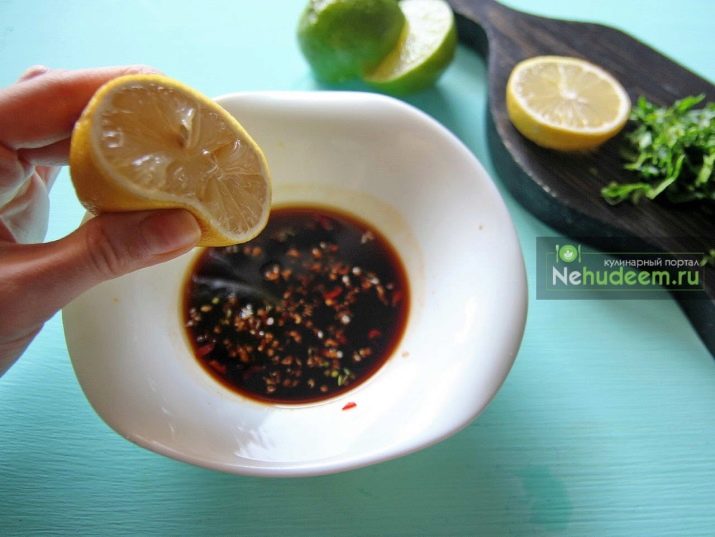 В соевый соус (в количестве 3 ст. ложек) добавить 4 раздавленных долек чеснока, черный молотый перец, молотый корень имбиря, соль.