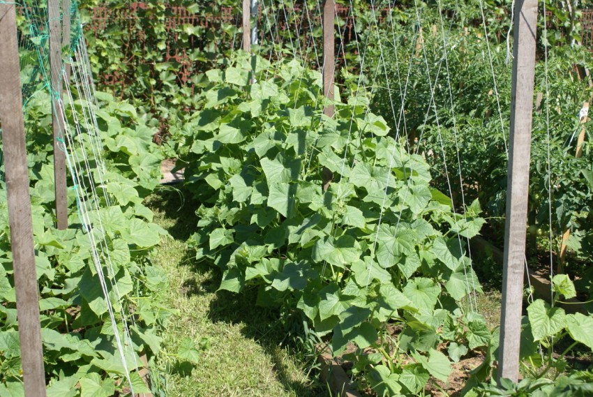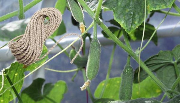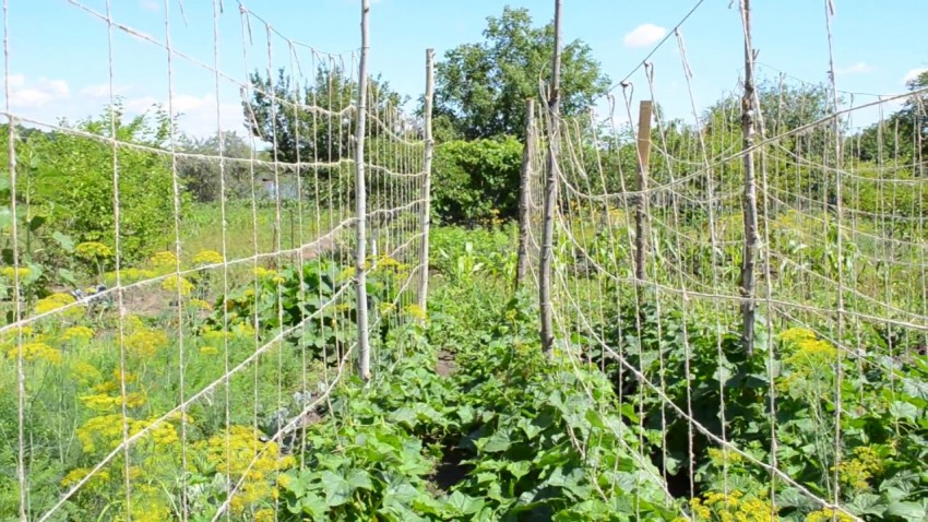 Также можно протянуть веревки вертикально, зацепляя их за горизонтально натянутые. Отростками огурец будет цепляться за дополнительную опору.