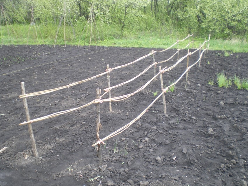 - Бечевка, закрепленная на крайнем колышке, крепится сверху на перекладине, затем опускается к колышку на противоположной стороне грядки, где тоже фиксируется. Аналогично натягивается бечевка по всей длине шпалеры.