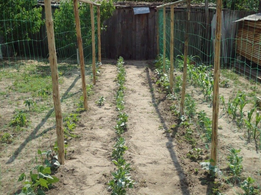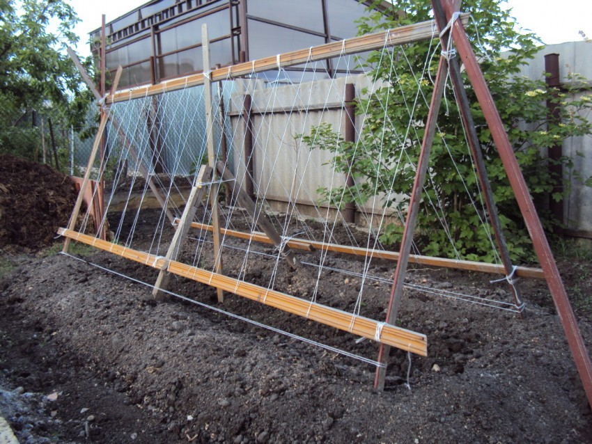 Затем натянуть между опорами веревку или проволоку, сделав несколько рядов сверху вниз на расстоянии в 20-25 см. Останется лишь направить стебли растений к нижней натянутой веревке.