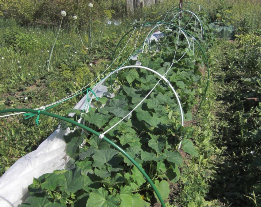 1. По всей длине грядки установить дуги из пластиковых труб. По горизонтали, по всей длине дуг натягиваются ленты, по которым и будут плестись огурцы.