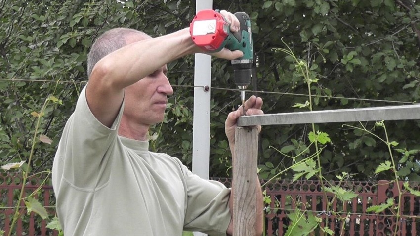 - Сверху к опорам прикрепить перекладину, используя уголки или скобы.