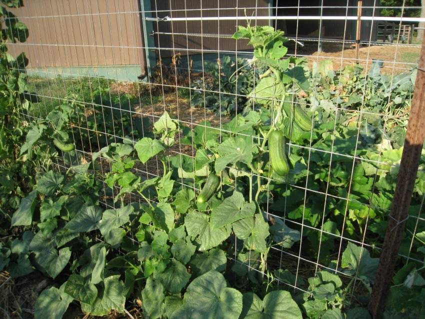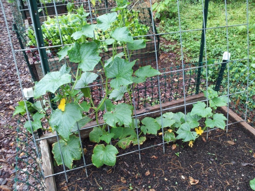Если посадить огурцы вдоль подходящего забора, то они будут расти, цепляясь своими усиками за него. Но, после сбора урожая его придется очищать от засохших плетений.
