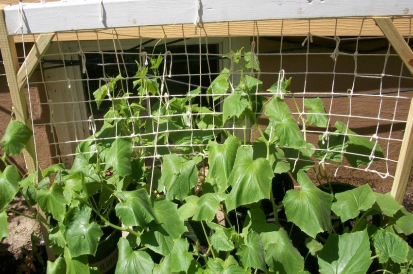 В магазинах продаются специальные сетки с большими секциями для выращивания вьющихся растений. Делаются они из надежного прочного материала. Сетку растягивают, прикрепляя к вертикальным опорам или любой жесткой опоре. Огурцы, цепляясь за ячейки сетки, плетутся по ней.