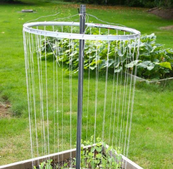 По другую сторону грядки можно сделать такую же конструкцию, чтобы натянуть горизонтальные нити для крепления растений. Или же каркас можно использовать для вертикальной подвязки.