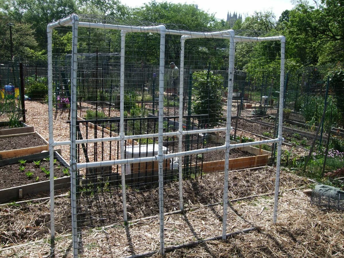 Это очень простая и бюджетная конструкция. Потребуются трубы, крепления и “утюжок” для пайки (если потребуется соединить две трубы до нужно длины). Собрать каркас можно всего за пару часов. Он будет легким и прочным. В отличие от древесины и металла, пластик не вступает в реакцию с почвой и не подвержен воздействию влаги. Поэтому многие дачники предпочитают именно этот вариант шпалер для огурчиков.