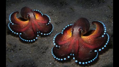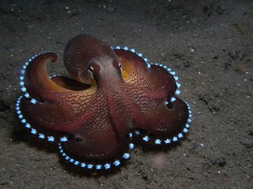 - Синекольчатый осьминог. Небольшие моллюски, отличительной особенностью которых являются расположенные по телу кольца яркого синего цвета. Кольчатые осьминоги довольно агрессивны и считаются наиболее опасными среди ядовитых животных.