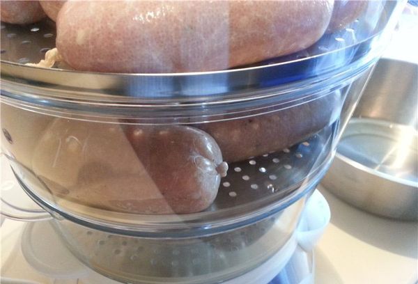 В пароварке. Подходящую чашу смазываем сливочным маслом. Выкладываем на нее очищенные от искусственной оболочки или натуральные продукты. Вода и соль не используются. Запускаем прибор примерно на 10 минут или чуть больше, если на подачу пара уходит много времени. После такой обработки с изделий должна очень легко сходить натуральная оболочка. Если этого не происходит, компонент скорее всего просто не доведен до нужного состояния.