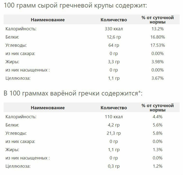 Обратите внимание, что калорийность гречки равна 308 ккал, а пищевая ценность продукта составляет: