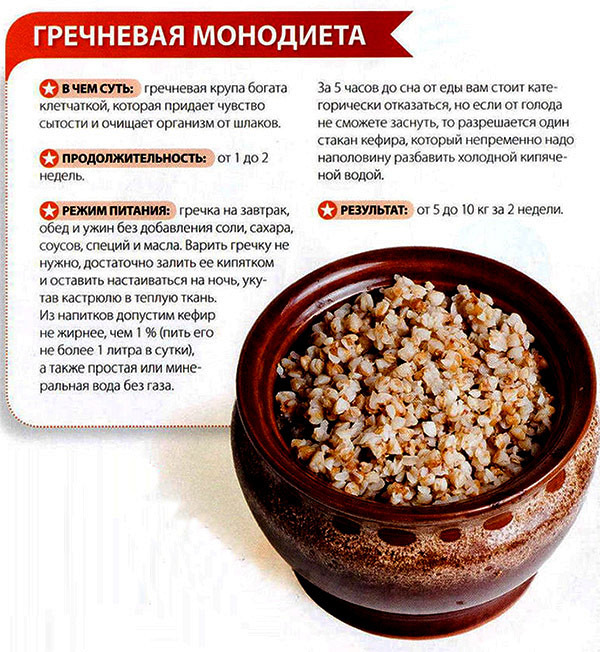 Она длится 7 дней. Можно выбрать один сорт круп и питаться только им, а можно ежедневно менять крупы. В обоих вариантах организм получает необходимое количество питательных веществ и избавляется от лишних килограммов.