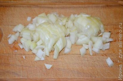- Лук чистим и нарезаем сначала полукольцами, а затем мелкими кубиками.