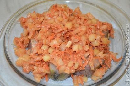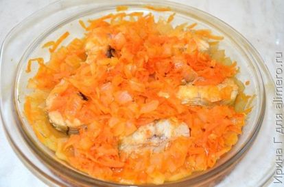 - Сверху их покрываем луково-морковной смесью. Необходимо, чтобы овощи целиком покрывали рыбу.