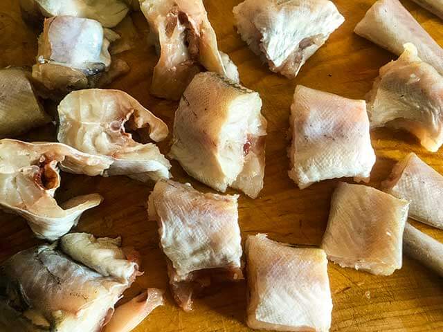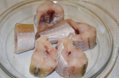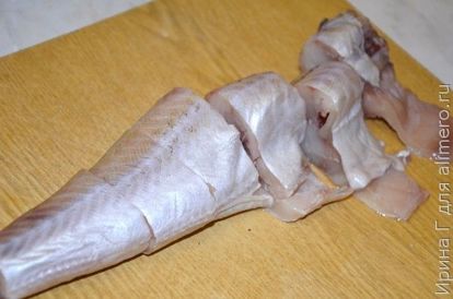 - Размороженные тушки минтая необходимо очистить и хорошенько вымыть под проточной водой. Затем избавляемся от плавников и хвоста, после чего нарезаем порционными кусочками (толщина – примерно 20 миллиметров).
